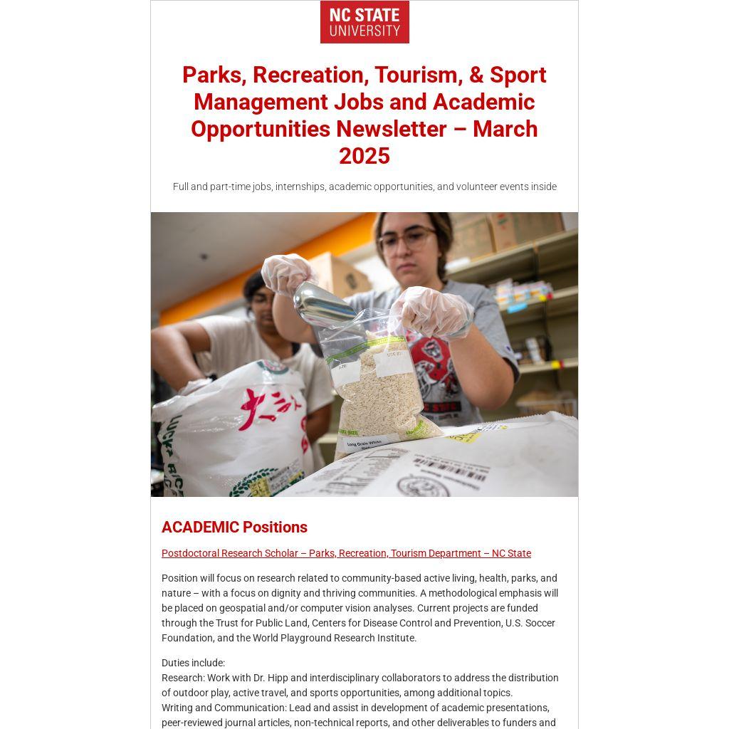 Parks, Recreation, Tourism, & Sport Management Jobs and Academic Opportunities Newsletter – March 2025