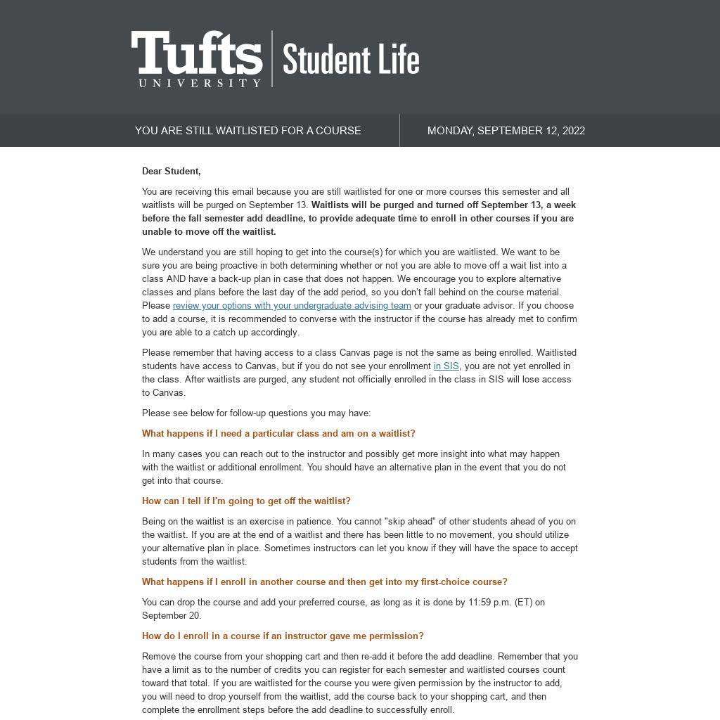 You are receiving this email because you are still waitlisted for one or more courses this semester and all waitlists will be purged on September 13. Waitlists will be purged and turned off September 13, a week before the fall semester add deadline, to provide adequate time to enroll in other courses if you are unable to move off the waitlist.
