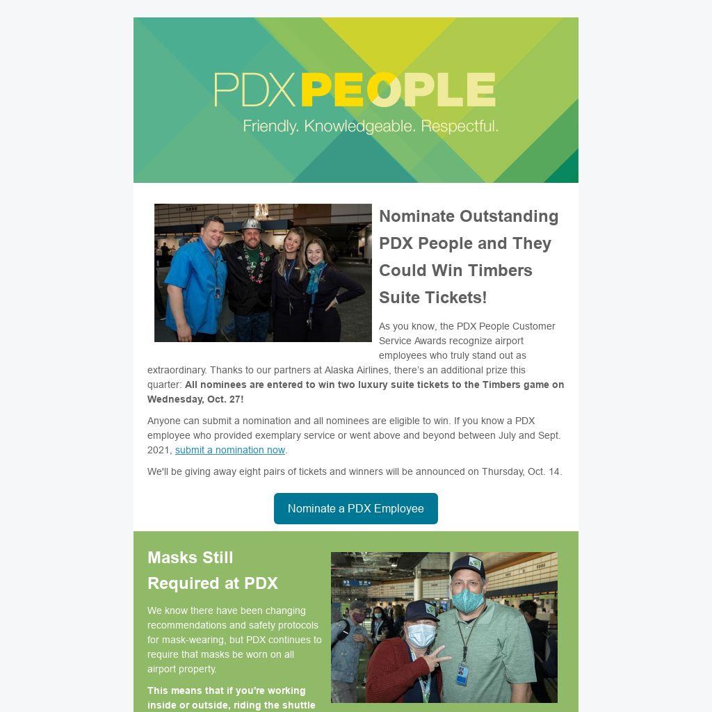 As you know, the PDX People Customer Service Awards recognize airport employees who truly stand out as extraordinary. Thanks to our partners at Alaska Airlines, there’s an additional prize this quarter: All nominees are entered to win two luxury suite tickets to the Timbers game on Wednesday, Oct. 27!