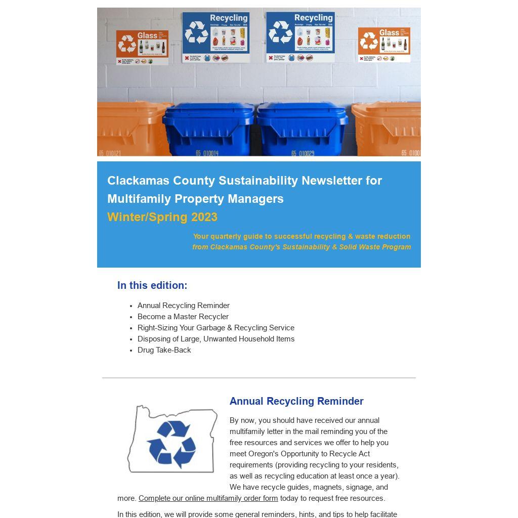 Clackamas County Sustainability Newsletter for Multifamily Property Managers Winter/Spring 2023