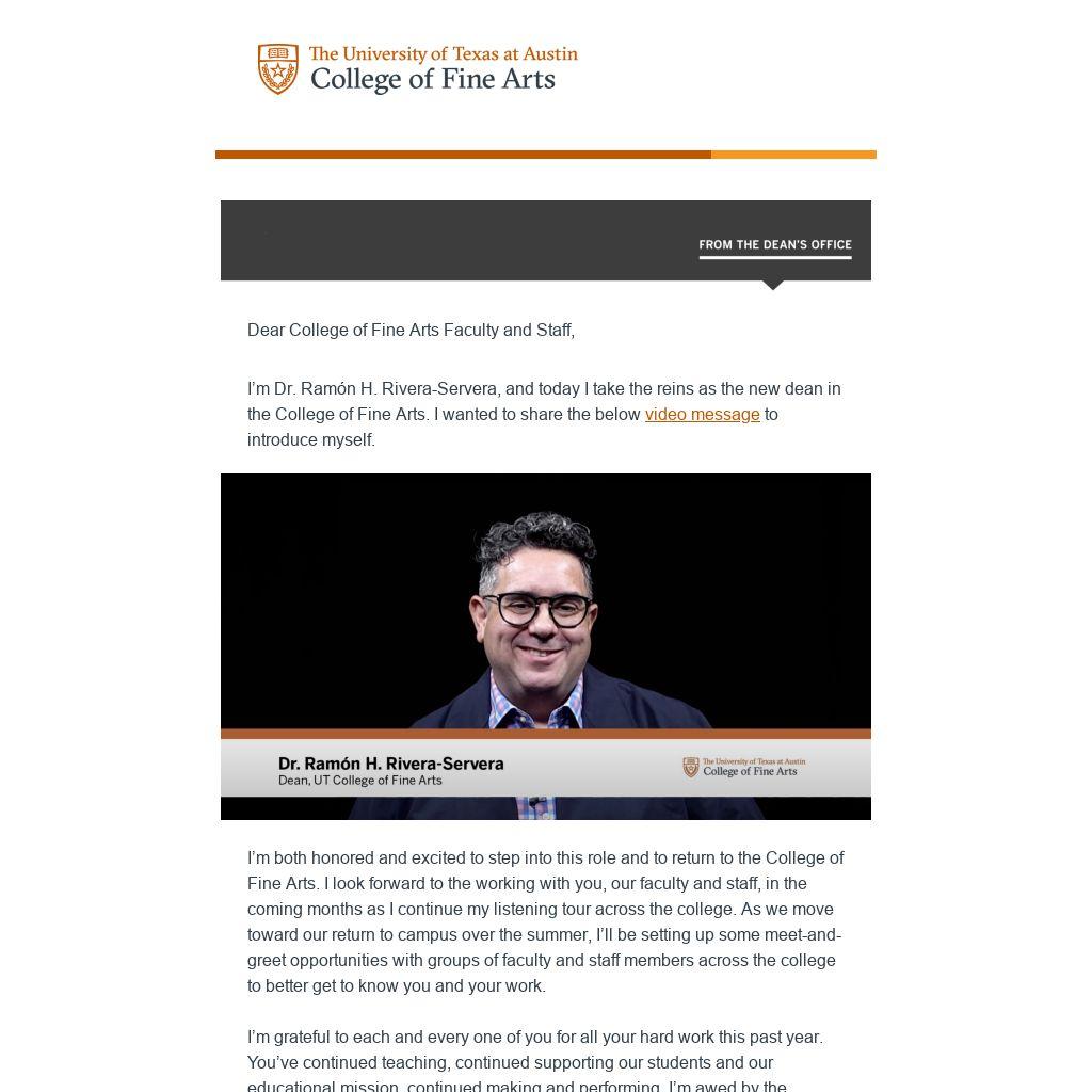 I’m both honored and excited to step into this role and to return to the College of Fine Arts. I look forward to the working with you, our faculty and staff, in the coming months as I continue my listening tour across the college. As we move toward our return to campus over the summer, I’ll be setting up some meet-and-greet opportunities with groups of faculty and staff members across the college to better get to know you and your work.