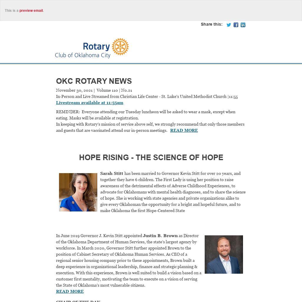 OKC Rotary NewsNovember 30, 2021 | Volume 110 | No.21 In-Person and Live Streamed from Christian Life Center - St. Luke's United Methodist Church |11:55