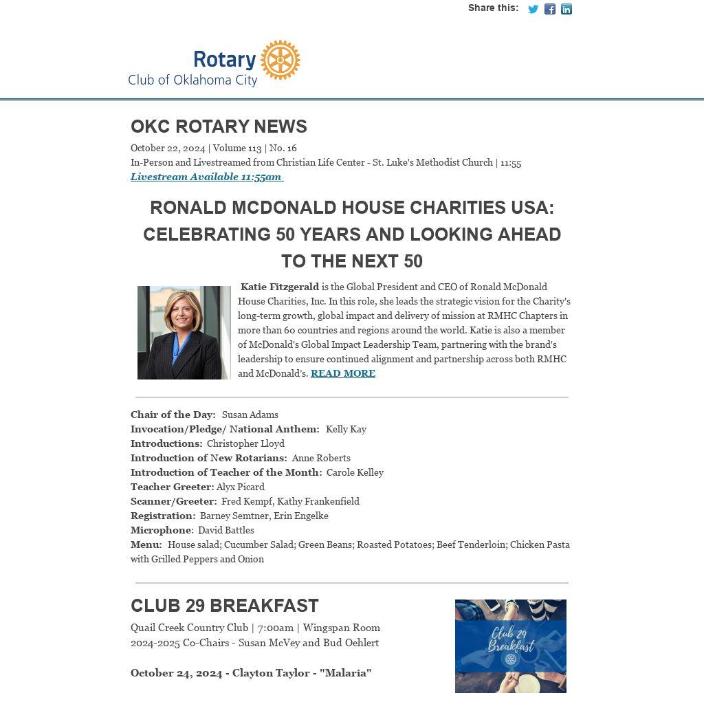 Rotary Club 29 has an online membership directory which contains current content information for all club members. The link to access the Club 29 directory can be found at the top of  the home page of  okcrotary.com or by clicking  here.