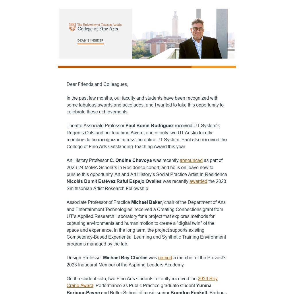 Theatre Associate Professor Paul Bonin-Rodriguez received UT System’s Regents Outstanding Teaching Award, one of only two UT Austin faculty members to be recognized across the entire UT System. Paul also received the College of Fine Arts Outstanding Teaching Award this year.