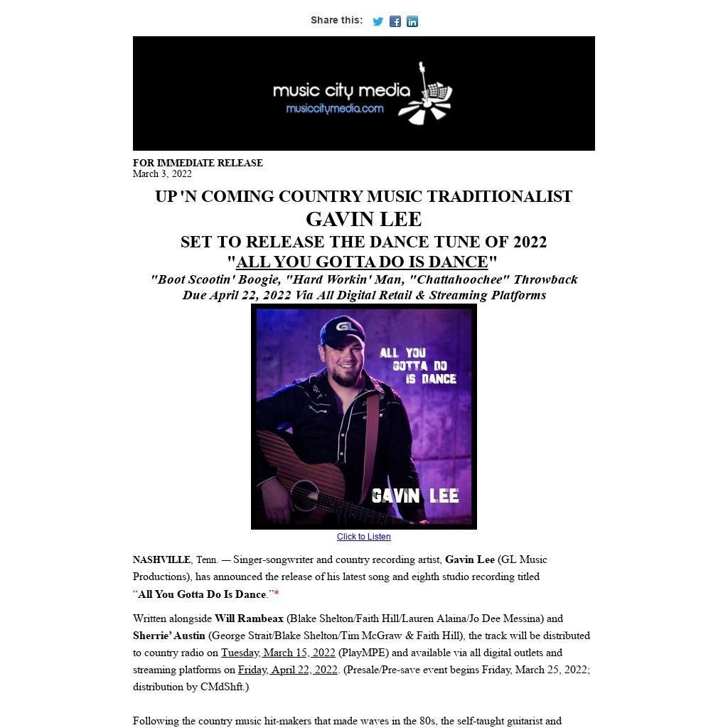 “My music has just kind of evolved naturally in the direction and vein that it’s in, and ‘All You Gotta Do Is Dance’ is right down the pipeline,“ said Floridian based Gavin Lee. “I wanted to write a tune to move people to get on their feet. The storyline is about a girl that’s had a crappy week and heads to the club to dance away her problems and stress. It’s a perfect dance tune for the honky tonks and bars.”