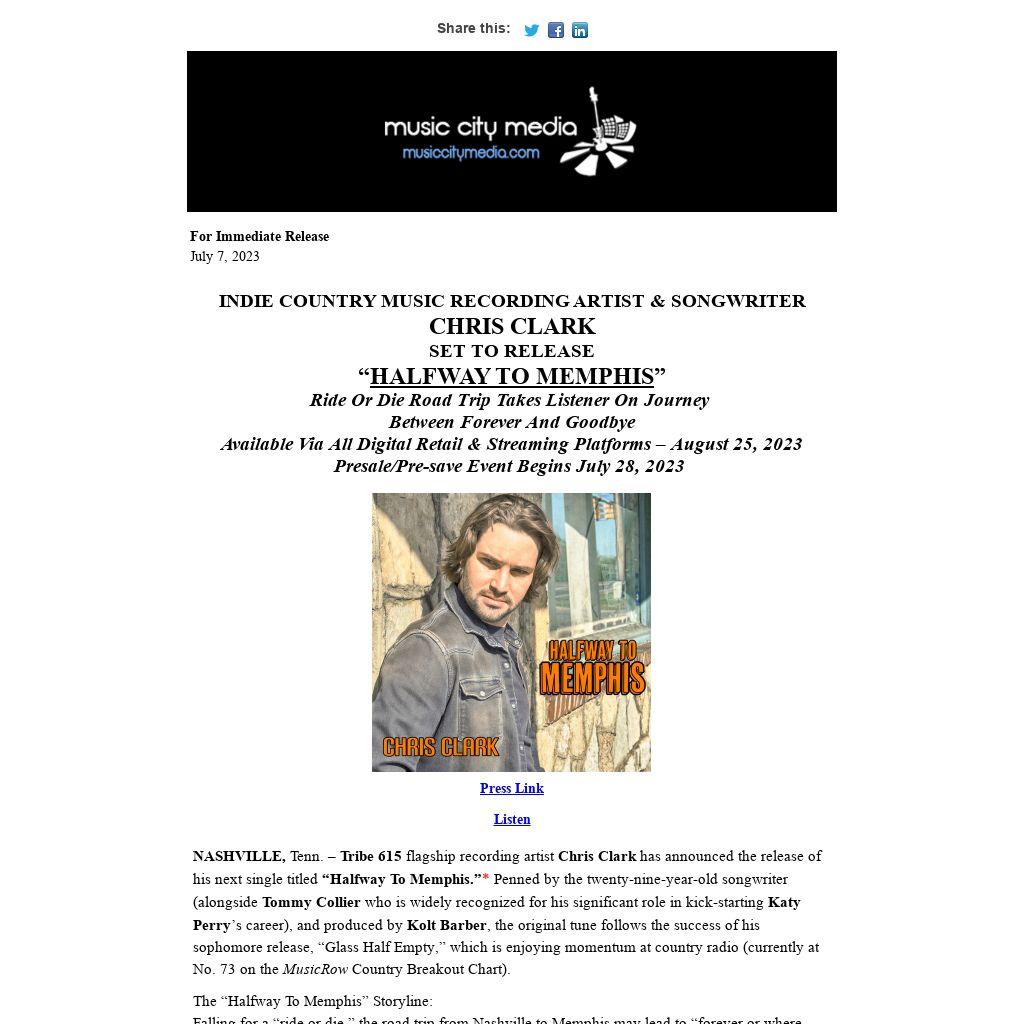 NASHVILLE, Tenn. – Tribe 615 flagship recording artist Chris Clark has announced the release of his next single titled “Halfway To Memphis.”* Penned by the twenty-nine-year-old songwriter (alongside Tommy Collier who is widely recognized for his significant role in kick-starting Katy Perry’s career), and produced by Kolt Barber, the original tune follows the success of his sophomore release, “Glass Half Empty,” which is enjoying momentum at country radio (currently at No. 73 on the MusicRow Country Breakout Chart).