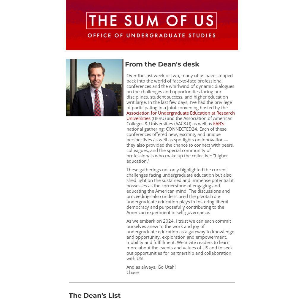 As we embark on 2024, I trust we can each commit ourselves anew to the work and joy of undergraduate education as a gateway to knowledge and opportunity, exploration and empowerment, mobility and fulfillment. We invite readers to learn more about the events and values of US and to seek out opportunities for partnership and collaboration with US!