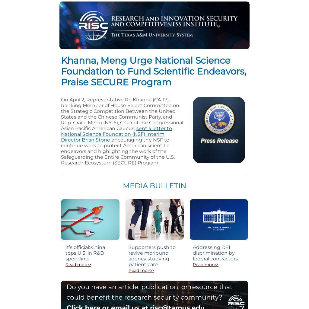 On April 2, Representative Ro Khanna (CA-17), Ranking Member of House Select Committee on the Strategic Competition Between the United States and the Chinese Communist Party, and Rep. Grace Meng (NY-6), Chair of the Congressional Asian Pacific American Caucus, sent a letter to National Science Foundation (NSF) Interim Director Brian Stone encouraging the NSF to continue work to protect American scientific endeavors and highlighting the work of the Safeguarding the Entire Community of the U.S. Research Ecosystem (SECURE) Program.