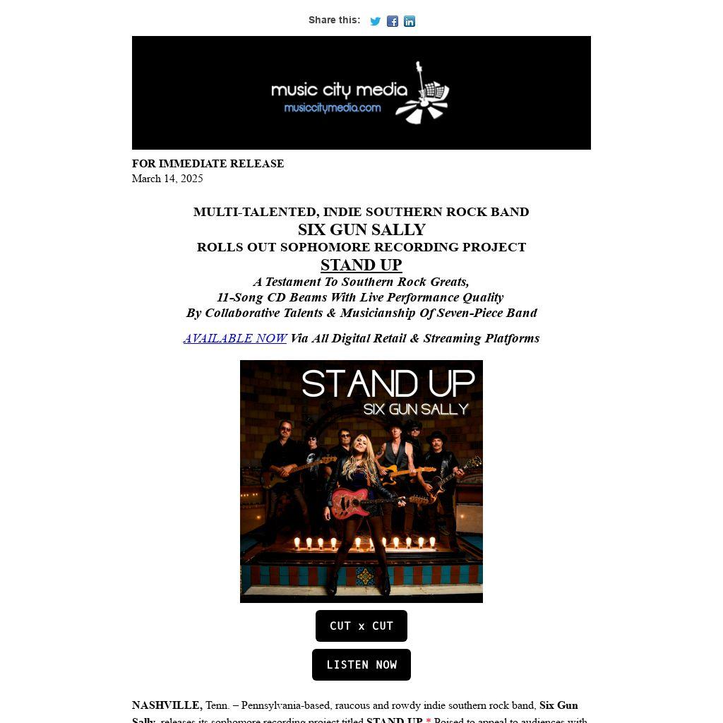 NASHVILLE, Tenn. – Pennsylvania-based, raucous and rowdy indie southern rock band, Six Gun Sally, releases its sophomore recording project titled STAND UP.* Poised to appeal to audiences with an appetite for classic rock, Southern rock and rockin' country music entertainment, the full-length album is AVAILABLE NOW via all major digital retail and streaming platforms.