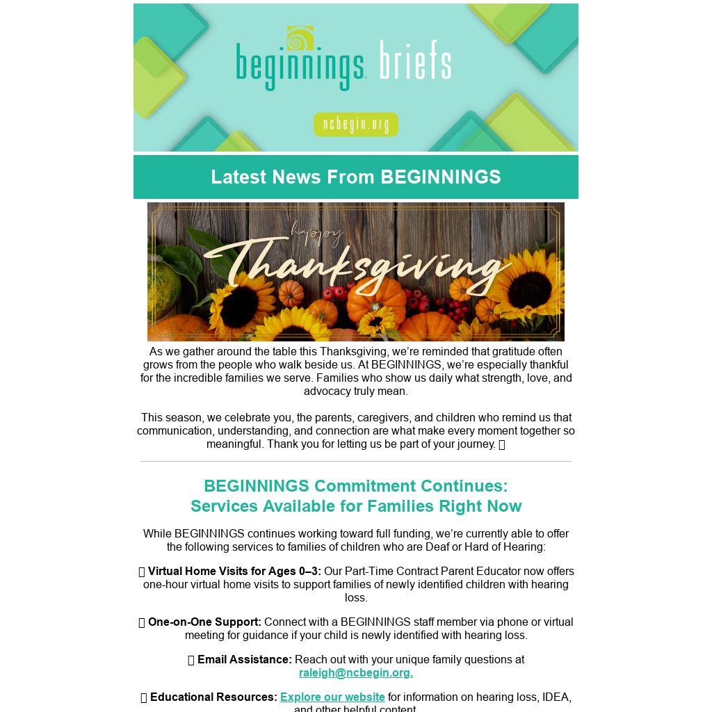 | As we gather around the table this Thanksgiving, we’re reminded that gratitude often grows from the people who walk beside us. At BEGINNINGS, we’re especially thankful for the incredible families we serve. Families who show us daily what strength, love, and advocacy truly mean.