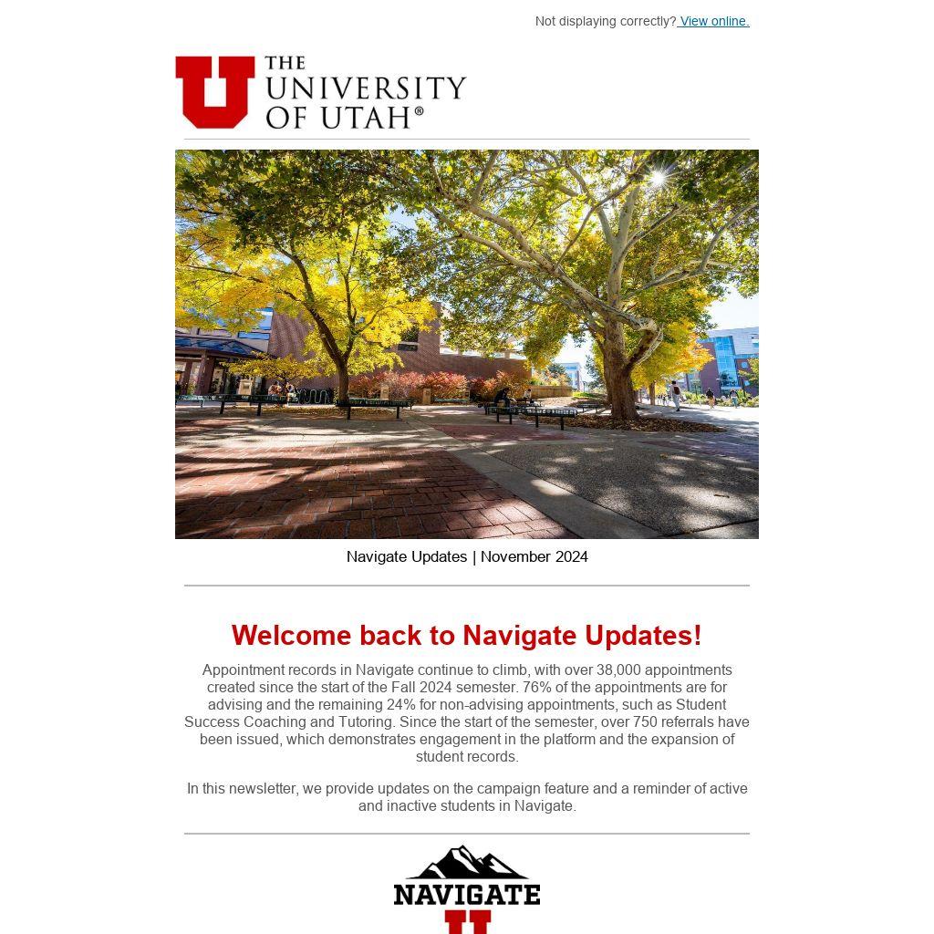 For technical questions, configuration requests, access issues, or usage questions, email navigateinfo@utah.edu. For questions that are better asked in real time, join our Office Hours on Tuesdays at 3:00 p.m. MT via Teams.