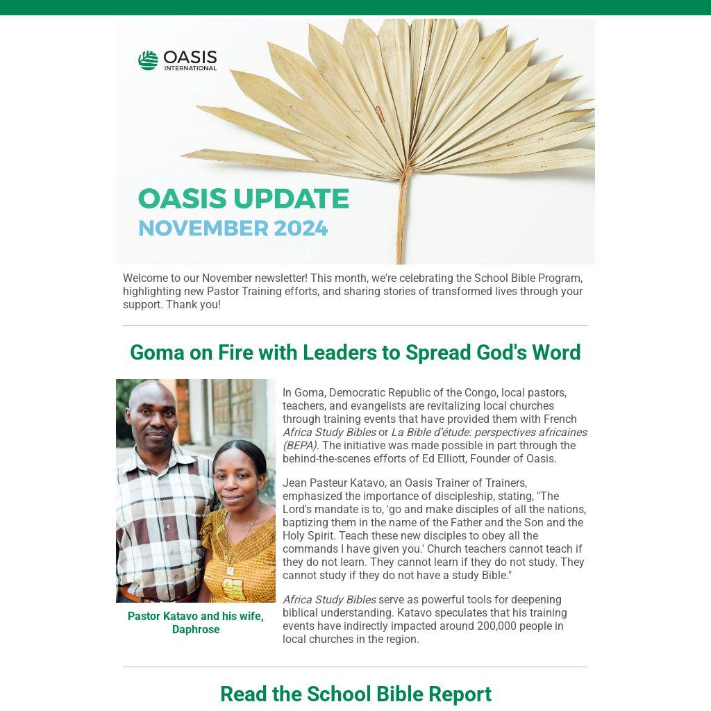 By providing Bibles through schools, we are growing a new generation of leaders rooted in Christian values. Read the report to learn more. Oasis plans to raise funds on Giving Tuesday to print thousands of School Bibles for the upcoming school year in Africa.
