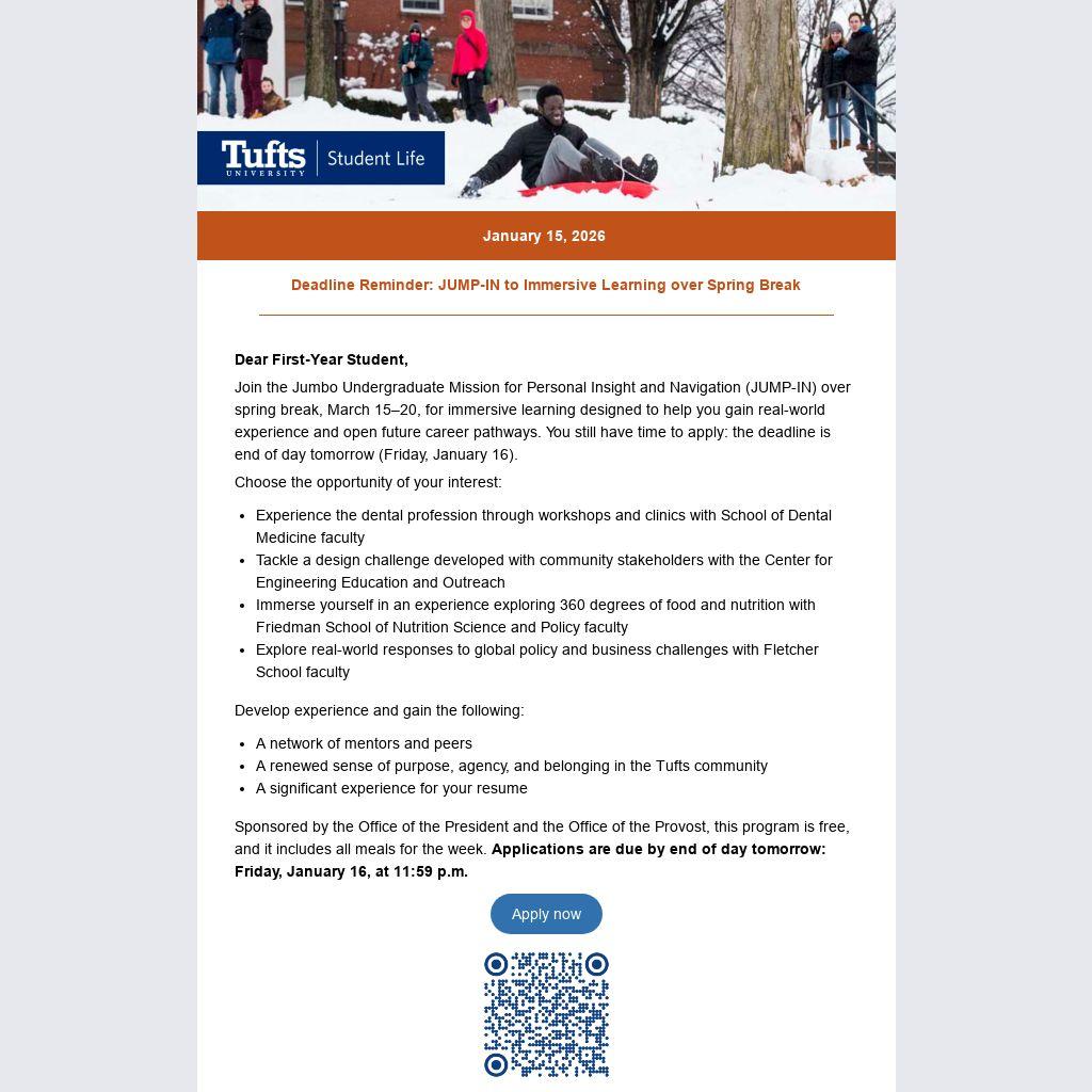 Join the Jumbo Undergraduate Mission for Personal Insight and Navigation (JUMP-IN) over spring break, March 15–20, for immersive learning designed to help you gain real-world experience and open future career pathways. You still have time to apply: the deadline is end of day tomorrow (Friday, January 16).