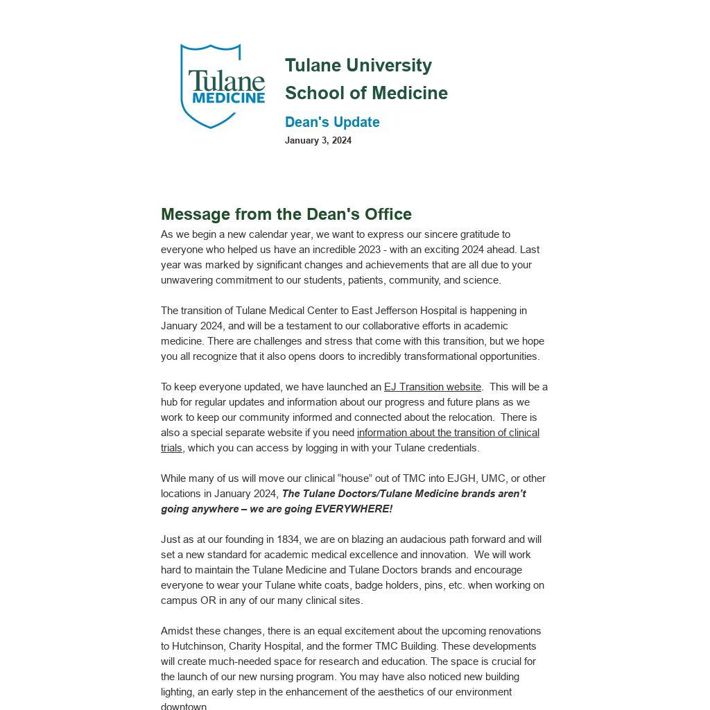 The transition of Tulane Medical Center to East Jefferson Hospital is happening in January 2024, and will be a testament to our collaborative efforts in academic medicine. There are challenges and stress that come with this transition, but we hope you all recognize that it also opens doors to incredibly transformational opportunities.