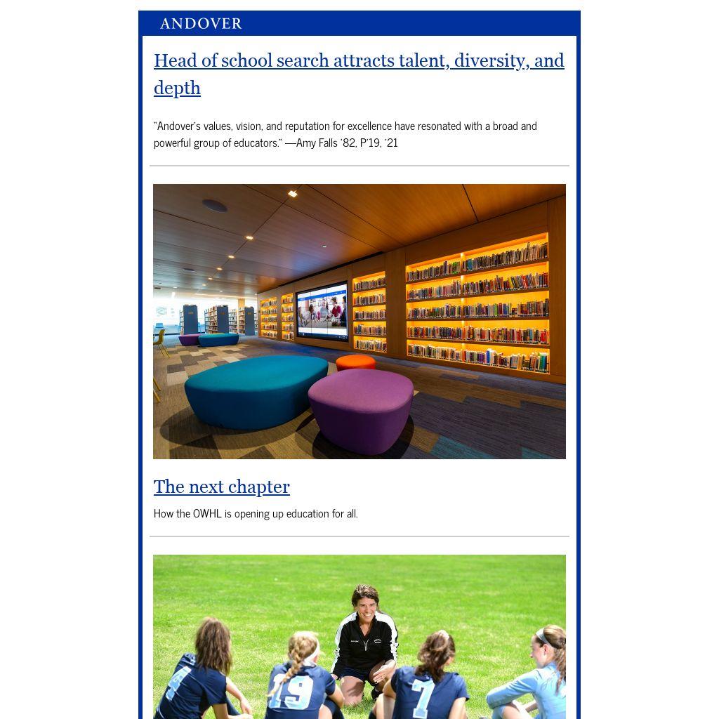 âAndoverâs values, vision, and reputation for excellence have resonated with a broad and powerful group of educators.â âAmy Falls â82, Pâ19, â21