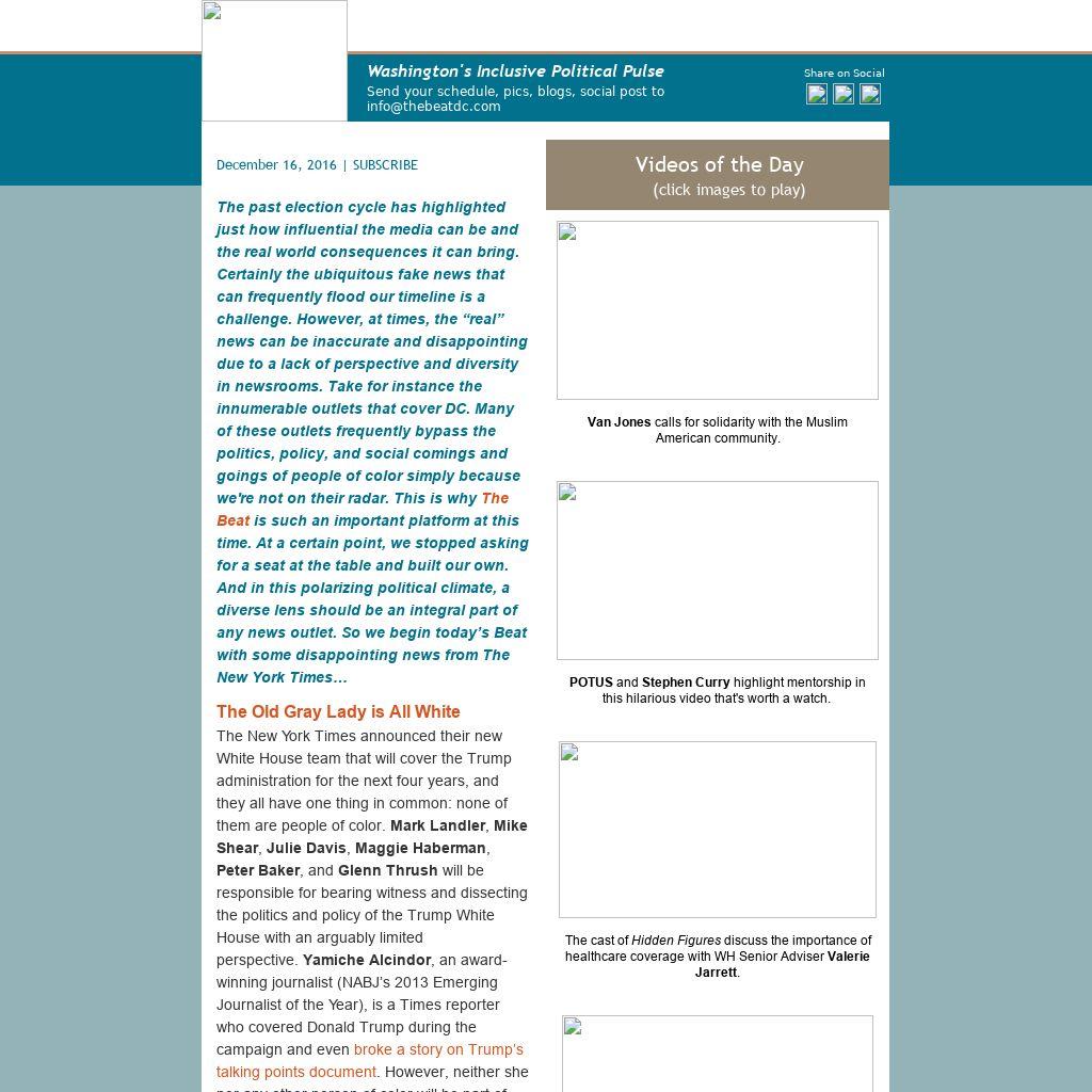 The past election cycle has highlighted just how influential the media can be and the real world consequences it can bring. Certainly the ubiquitous fake news that can frequently flood our timeline is a challenge. However, at times, the “real” news can be inaccurate and disappointing due to a lack of perspective and diversity in newsrooms. Take for instance the innumerable outlets that cover DC. Many of these outlets frequently bypass the politics, policy, and social comings and goings of people of color simply because we're not on their radar. This is why The Beat is such an important platform at this time. At a certain point, we stopped asking for a seat at the table and built our own. And in this polarizing political climate, a diverse lens should be an integral part of any news outlet. So we begin today’s Beat with some disappointing news from The New York Times…