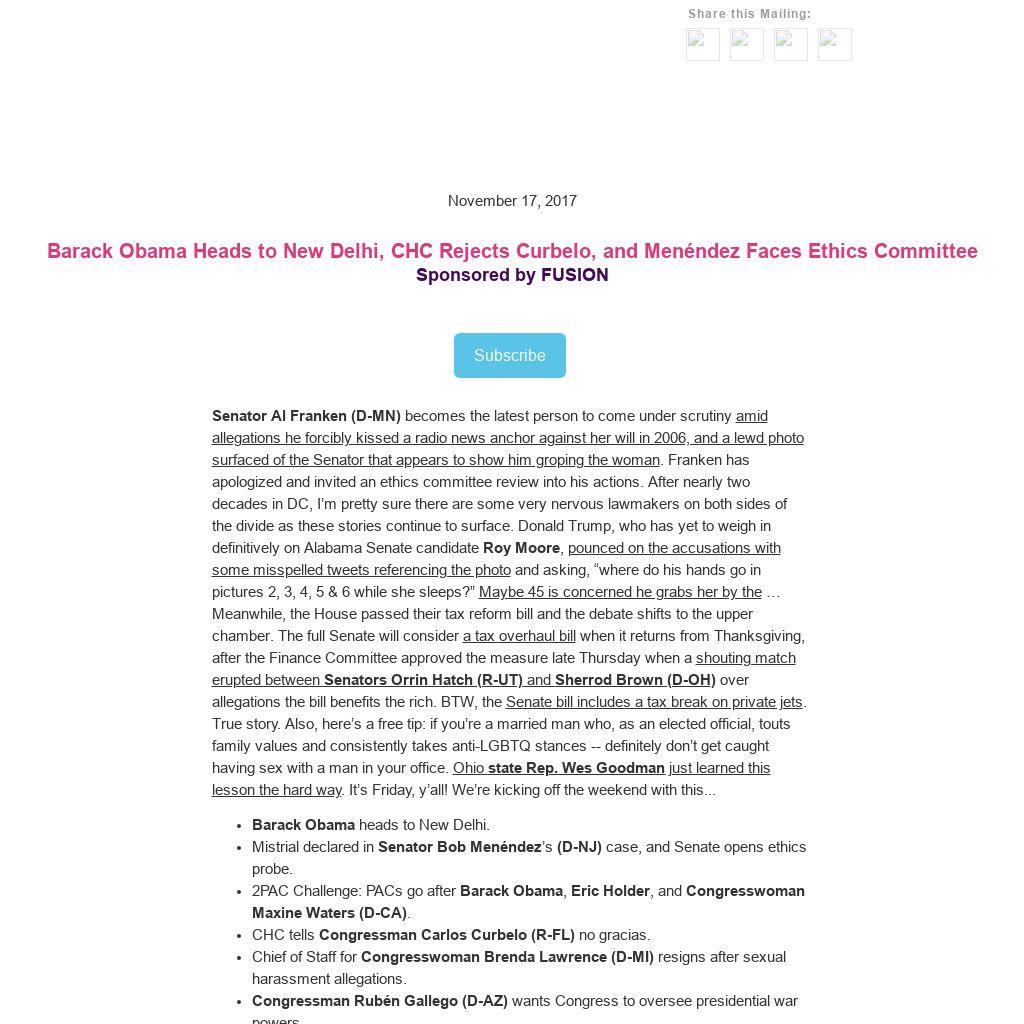 Senator Al Franken (D-MN) becomes the latest person to come under scrutiny amid allegations he forcibly kissed a radio news anchor against her will in 2006, and a lewd photo surfaced of the Senator that appears to show him groping the woman. Franken has apologized and invited an ethics committee review into his actions. After nearly two decades in DC, I’m pretty sure there are some very nervous lawmakers on both sides of the divide as these stories continue to surface. Donald Trump, who has yet to weigh in definitively on Alabama Senate candidate Roy Moore, pounced on the accusations with some misspelled tweets referencing the photo and asking, “where do his hands go in pictures 2, 3, 4, 5 & 6 while she sleeps?” Maybe 45 is concerned he grabs her by the … Meanwhile, the House passed their tax reform bill and the debate shifts to the upper chamber. The full Senate will consider a tax overhaul bill when it returns from Thanksgiving, after the Finance Committee approved the measure late Thursday when a shouting match erupted between Senators Orrin Hatch (R-UT) and Sherrod Brown (D-OH) over allegations the bill benefits the rich. BTW, the Senate bill includes a tax break on private jets. True story. Also, here’s a free tip: if you’re a married man who, as an elected official, touts family values and consistently takes anti-LGBTQ stances -- definitely don’t get caught having sex with a man in your office. Ohio state Rep. Wes Goodman just learned this lesson the hard way. It’s Friday, y’all! We’re kicking off the weekend with this...