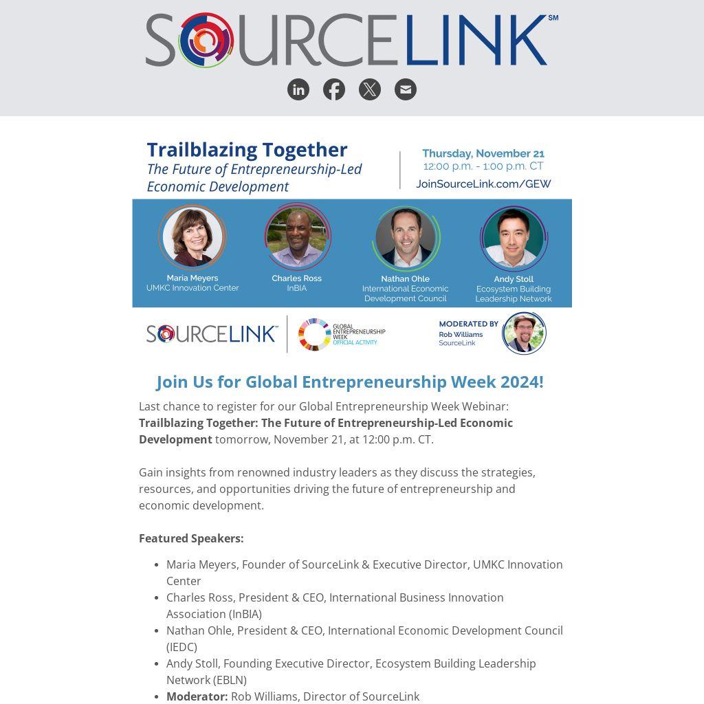 Last chance to register for our Global Entrepreneurship Week Webinar: Trailblazing Together: The Future of Entrepreneurship-Led Economic Development tomorrow, November 21, at 12:00 p.m. CT.
