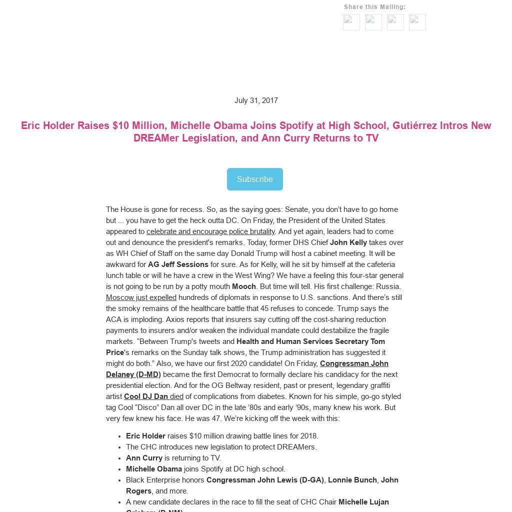 Wednesday, August 9th - 13th: The National Association of Black Journalists (NABJ) holds its annual convention and career fair in New Orleans. Click here for more information and to register. Thursday, August 10th - 13th: The Congressional Black Caucus Political Education & Leadership Institute sponsors the 2017 Mississippi Policy Conference in Tunica, MS. Click here for more information and to register. Monday, August 14th, 4P: The Center for American Progress sponsors a panel discussion, "The Power of Black Media and Journalists During the Trump Administration." Click here to RSVP. Wednesday, August 16th - 17th: The annual U.S.-Mexico Border Summit. El Paso, TX & Cuidad Juárez, Chihuahua. Featured guests include keynote speaker Ana Navarro, Republican strategist and CNN analyst. Click here for more information and to register.