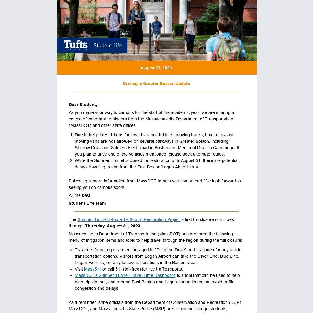 Following is more information from MassDOT to help you plan ahead. We look forward to seeing you on campus soon!