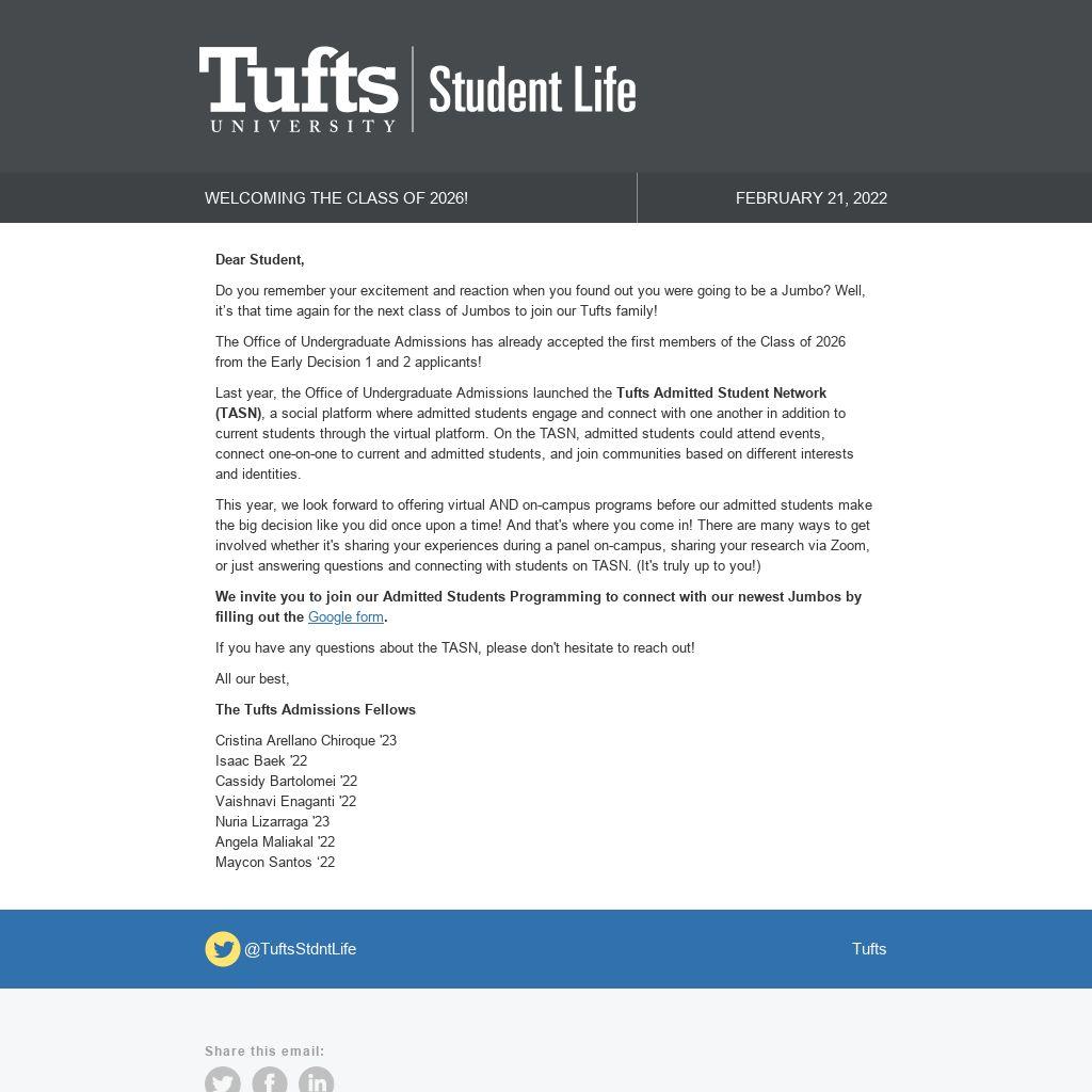 Last year, the Office of Undergraduate Admissions launched the Tufts Admitted Student Network (TASN), a social platform where admitted students engage and connect with one another in addition to current students through the virtual platform. On the TASN, admitted students could attend events, connect one-on-one to current and admitted students, and join communities based on different interests and identities.