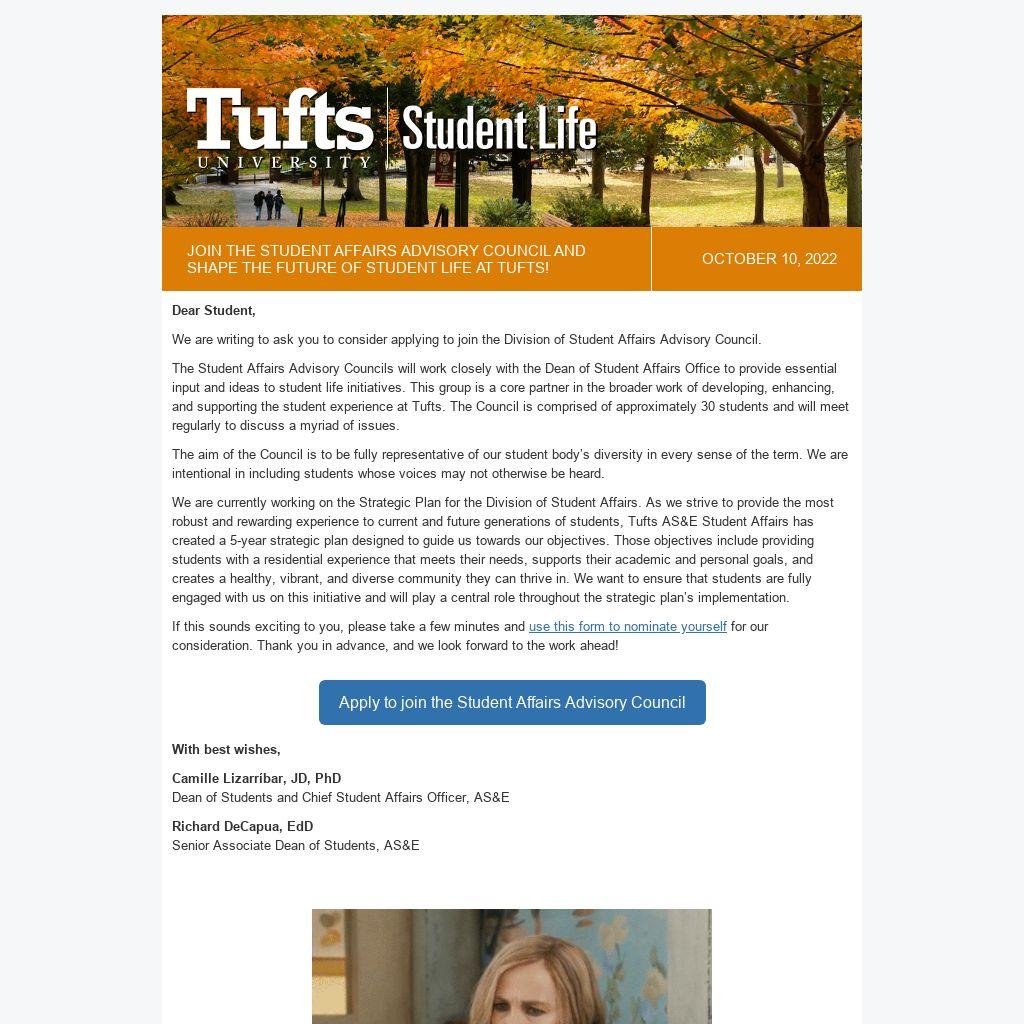 We are writing to ask you to consider applying to join the Division of Student Affairs Advisory Council.