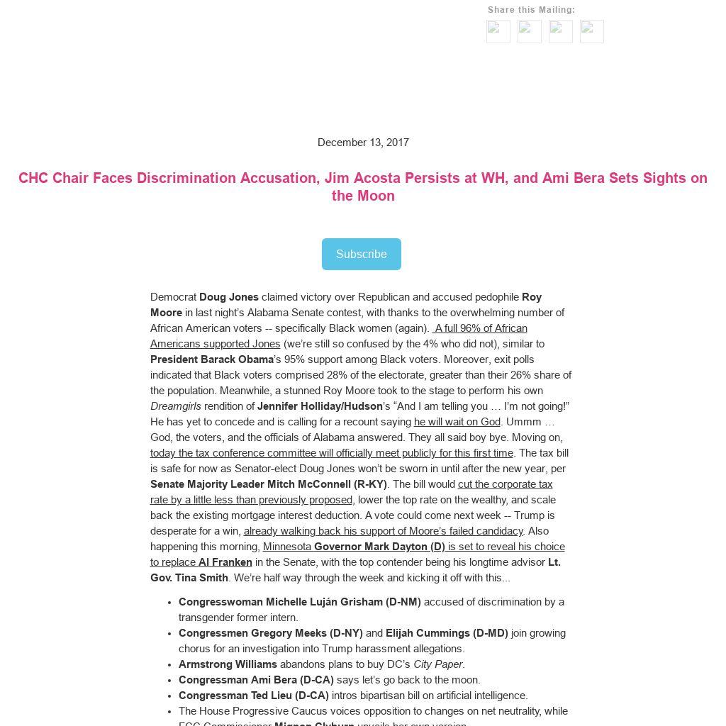Democrat Doug Jones claimed victory over Republican and accused pedophile Roy Moore in last night’s Alabama Senate contest, with thanks to the overwhelming number of African American voters -- specifically Black women (again). A full 96% of African Americans supported Jones (we’re still so confused by the 4% who did not), similar to President Barack Obama’s 95% support among Black voters. Moreover, exit polls indicated that Black voters comprised 28% of the electorate, greater than their 26% share of the population. Meanwhile, a stunned Roy Moore took to the stage to perform his own Dreamgirls rendition of Jennifer Holliday/Hudson’s “And I am telling you … I’m not going!” He has yet to concede and is calling for a recount saying he will wait on God. Ummm … God, the voters, and the officials of Alabama answered. They all said boy bye. Moving on, today the tax conference committee will officially meet publicly for this first time. The tax bill is safe for now as Senator-elect Doug Jones won’t be sworn in until after the new year, per Senate Majority Leader Mitch McConnell (R-KY). The bill would cut the corporate tax rate by a little less than previously proposed, lower the top rate on the wealthy, and scale back the existing mortgage interest deduction. A vote could come next week -- Trump is desperate for a win, already walking back his support of Moore’s failed candidacy. Also happening this morning, Minnesota Governor Mark Dayton (D) is set to reveal his choice to replace Al Franken in the Senate, with the top contender being his longtime advisor Lt. Gov. Tina Smith. We’re half way through the week and kicking it off with this...