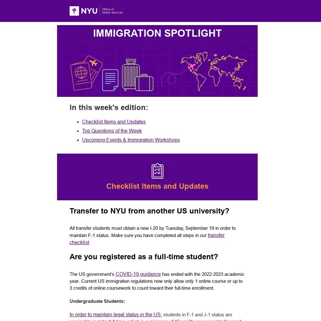 Transfer to NYU from another US university? All transfer students must obtain a new I-20 by Tuesday, September 19 in order to maintain F-1 status. Make sure you have completed all steps in our transfer checklist.