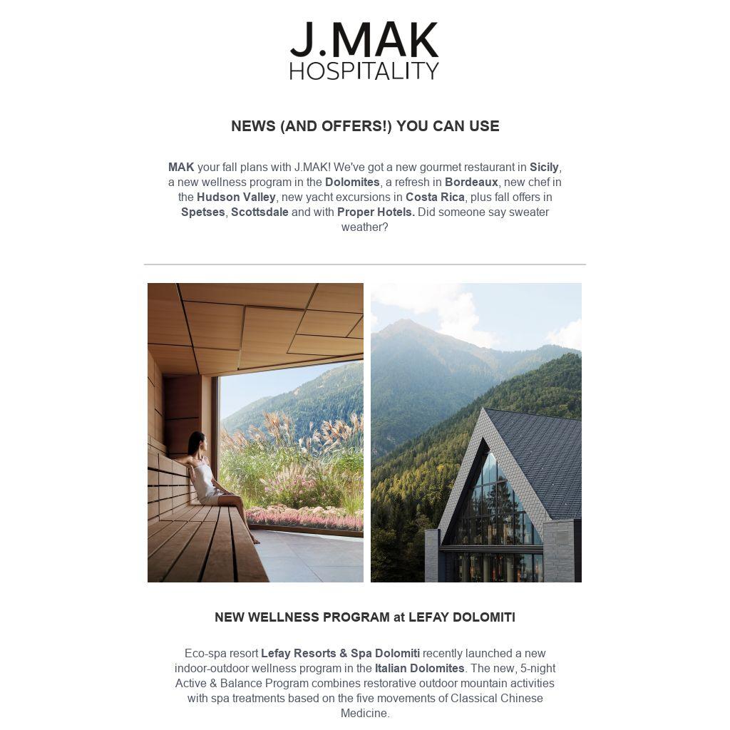 MAK your fall plans with J.MAK! We've got a new gourmet restaurant in Sicily, a new wellness program in the Dolomites, a refresh in Bordeaux, new chef in the Hudson Valley, new yacht excursions in Costa Rica, plus fall offers in Spetses, Scottsdale and with Proper Hotels. Did someone say sweater weather?