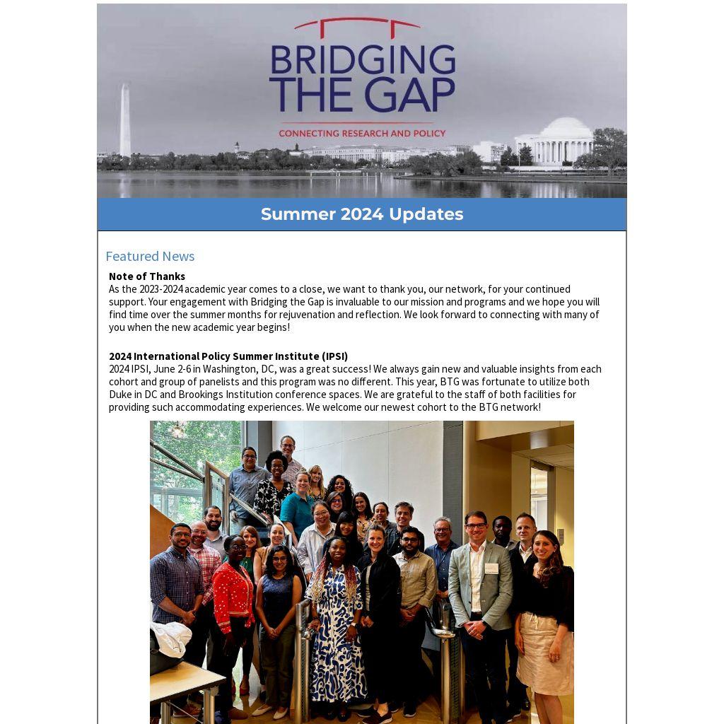 2024 IPSI, June 2-6 in Washington, DC, was a great success! We always gain new and valuable insights from each cohort and group of panelists and this program was no different. This year, BTG was fortunate to utilize both Duke in DC and Brookings Institution conference spaces. We are grateful to the staff of both facilities for providing such accommodating experiences. We welcome our newest cohort to the BTG network!