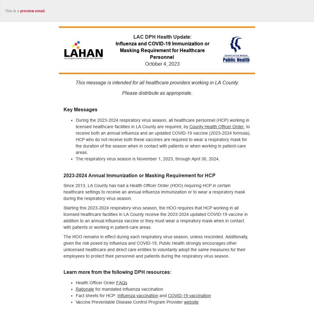 Starting this 2023-2024 respiratory virus season, the HOO requires that HCP working in all licensed healthcare facilities in LA County receive the 2023-2024 updated COVID-19 vaccine in addition to an annual influenza vaccine or they must wear a respiratory mask when in contact with patients or working in patient-care areas.