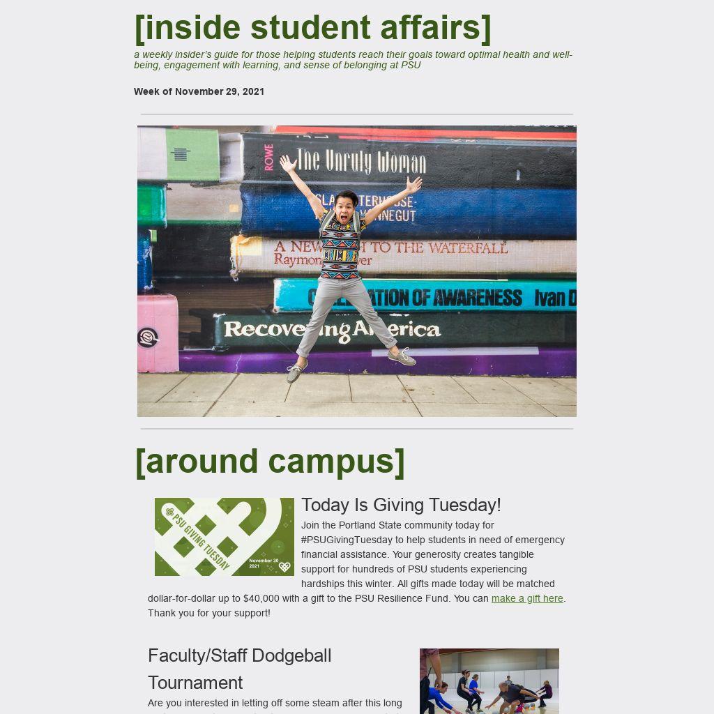 [inside student affairs]a weekly insider’s guide for those helping students reach their goals toward optimal health and well-being, engagement with learning, and sense of belonging at PSU
