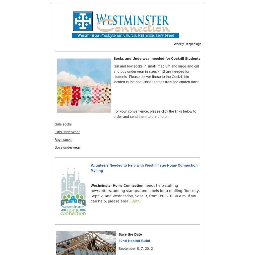 Girl and boy socks in small, medium and large and girl and boy underwear in sizes 4-12 are needed for students. Please deliver these to the Cockrill bin located in the coat closet across from the church office.