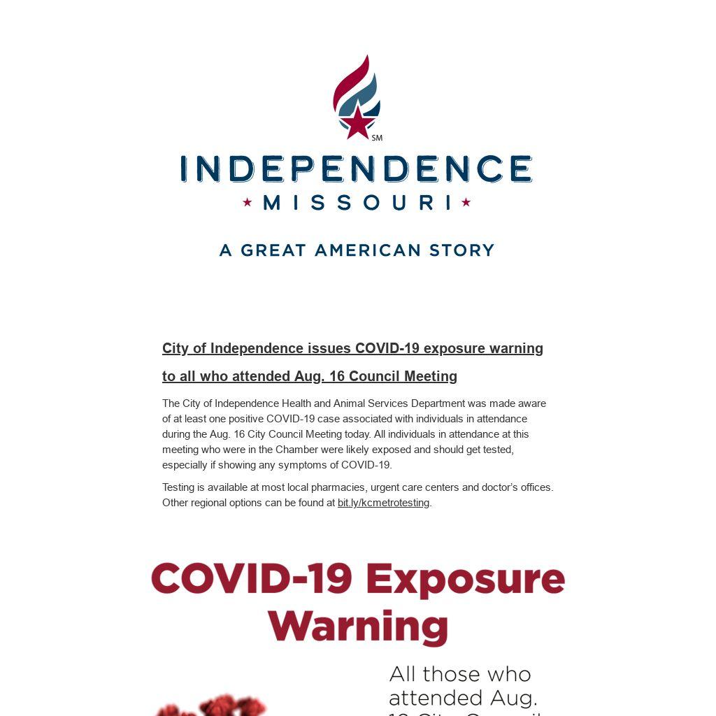 The City of Independence Health and Animal Services Department was made aware of at least one positive COVID-19 case associated with individuals in attendance during the Aug. 16 City Council Meeting today. All individuals in attendance at this meeting who were in the Chamber were likely exposed and should get tested, especially if showing any symptoms of COVID-19.