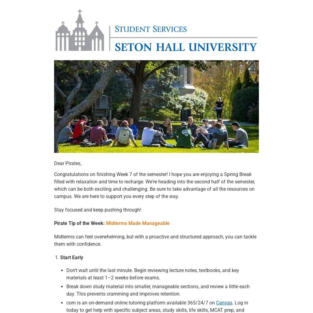 Congratulations on finishing Week 7 of the semester! I hope you are enjoying a Spring Break filled with relaxation and time to recharge. We're heading into the second half of the semester, which can be both exciting and challenging. Be sure to take advantage of all the resources on campus. We are here to support you every step of the way.