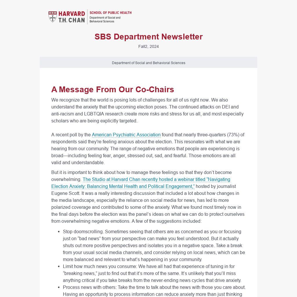 But it is important to think about how to manage these feelings so that they don’t become overwhelming. The Studio at Harvard Chan recently hosted a webinar titled “Navigating Election Anxiety: Balancing Mental Health and Political Engagement,” hosted by journalist Eugene Scott. It was a really interesting discussion that included a lot about how changes in the media landscape, especially the reliance on social media for news, has led to more polarized coverage and contributed to some of the anxiety. What we found most timely now in the final days before the election was the panel’s ideas on what we can do to protect ourselves from overwhelming negative emotions. A few of the suggestions included: