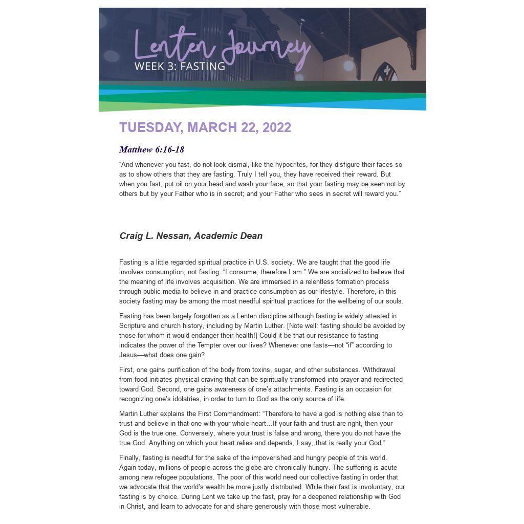 Fasting has been largely forgotten as a Lenten discipline although fasting is widely attested in Scripture and church history, including by Martin Luther. [Note well: fasting should be avoided by those for whom it would endanger their health!] Could it be that our resistance to fasting indicates the power of the Tempter over our lives? Whenever one fasts—not “if” according to Jesus—what does one gain?