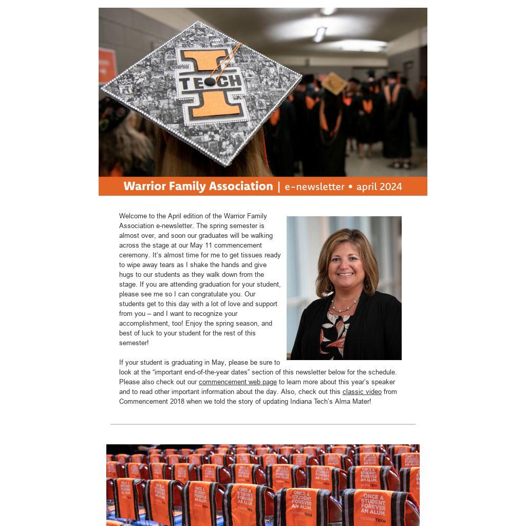 Welcome to the April edition of the Warrior Family Association e-newsletter. The spring semester is almost over, and soon our graduates will be walking across the stage at our May 11 commencement ceremony. It’s almost time for me to get tissues ready to wipe away tears as I shake the hands and give hugs to our students as they walk down from the stage. If you are attending graduation for your student, please see me so I can congratulate you. Our students get to this day with a lot of love and support from you – and I want to recognize your accomplishment, too! Enjoy the spring season, and best of luck to your student for the rest of this semester!