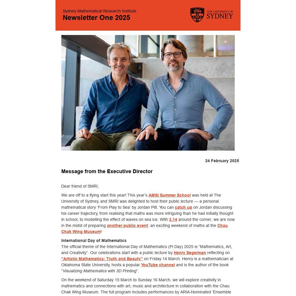 The core mission of SMRI is supporting fundamental research and collaboration in the mathematical sciences — through our visitor programs, themed semesters, and the weekly seminar series that are starting again this week. Subscribe to the weekly update or view the SMRI What's On calendar. If you are in Sydney, we would be delighted to see you at our weekly afternoon tea on Thursdays!