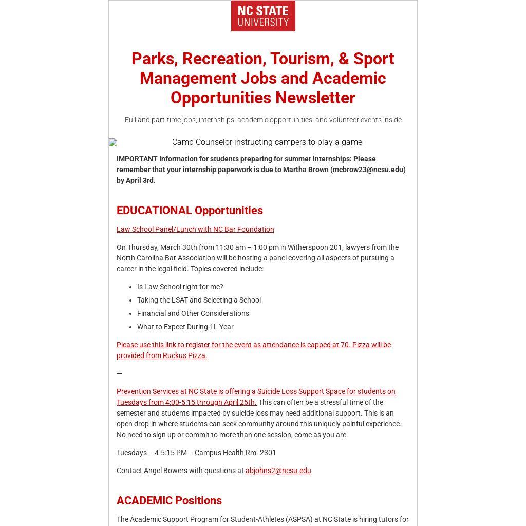 Parks, Recreation, Tourism, & Sport Management Jobs and Academic Opportunities Newsletter