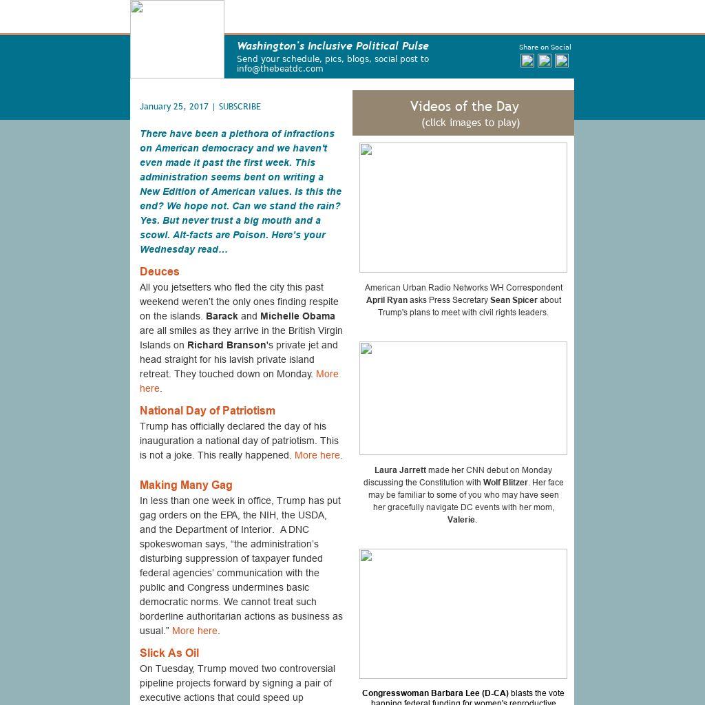 There have been a plethora of infractions on American democracy and we haven't even made it past the first week. This administration seems bent on writing a New Edition of American values. Is this the end? We hope not. Can we stand the rain? Yes. But never trust a big mouth and a scowl. Alt-facts are Poison. Here’s your Wednesday read…