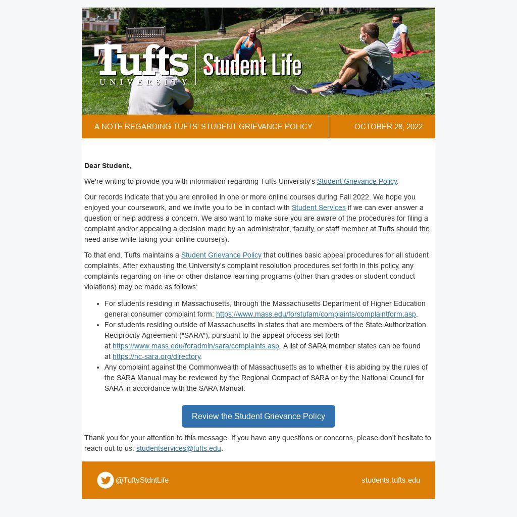 Our records indicate that you are enrolled in one or more online courses during Fall 2022. We hope you enjoyed your coursework, and we invite you to be in contact with Student Services if we can ever answer a question or help address a concern. We also want to make sure you are aware of the procedures for filing a complaint and/or appealing a decision made by an administrator, faculty, or staff member at Tufts should the need arise while taking your online course(s).