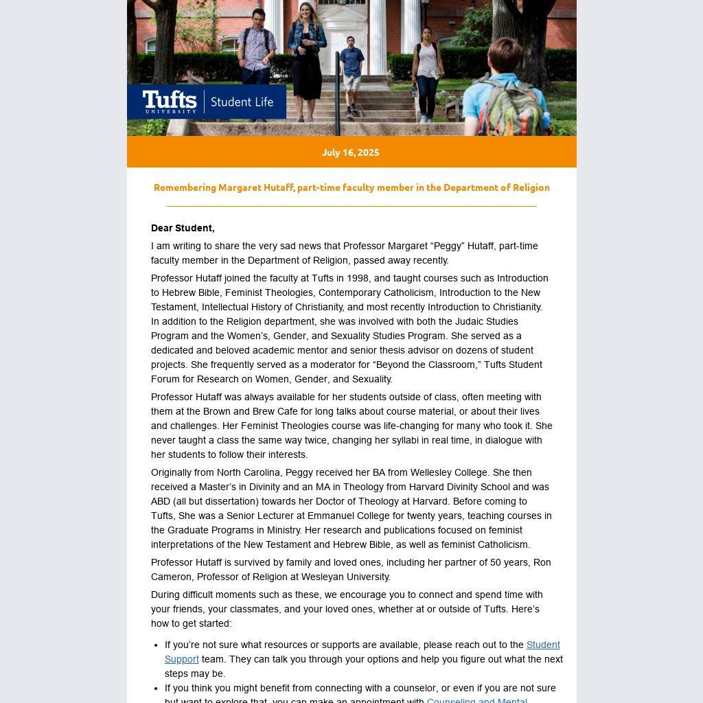 Professor Hutaff joined the faculty at Tufts in 1998, and taught courses such as Introduction to Hebrew Bible, Feminist Theologies, Contemporary Catholicism, Introduction to the New Testament, Intellectual History of Christianity, and most recently Introduction to Christianity. In addition to the Religion department, she was involved with both the Judaic Studies Program and the Women’s, Gender, and Sexuality Studies Program. She served as a dedicated and beloved academic mentor and senior thesis advisor on dozens of student projects. She frequently served as a moderator for “Beyond the Classroom,” Tufts Student Forum for Research on Women, Gender, and Sexuality.