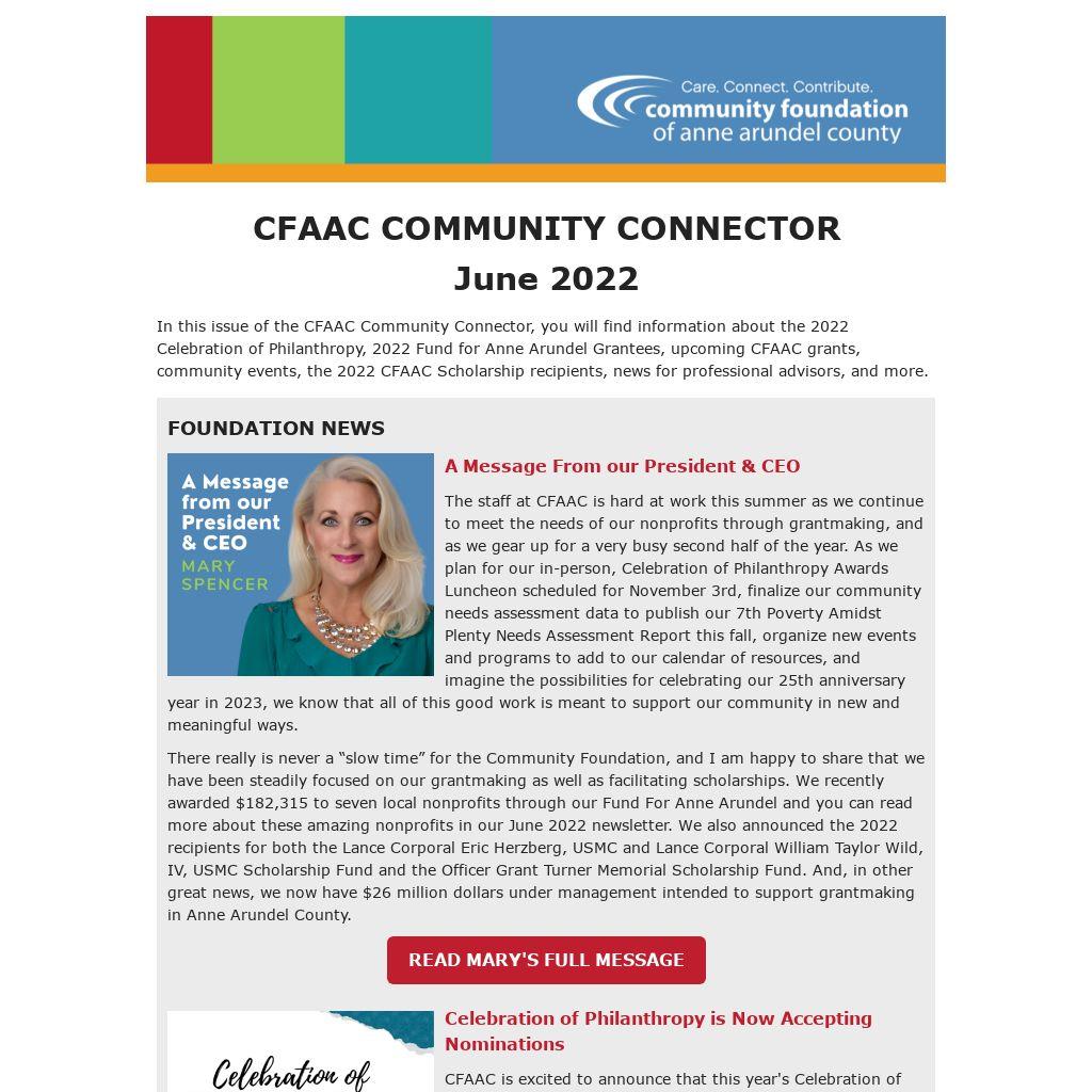 In this issue of the CFAAC Community Connector, you will find information about the 2022 Celebration of Philanthropy, 2022 Fund for Anne Arundel Grantees, upcoming CFAAC grants, community events, the 2022 CFAAC Scholarship recipients, news for professional advisors, and more.