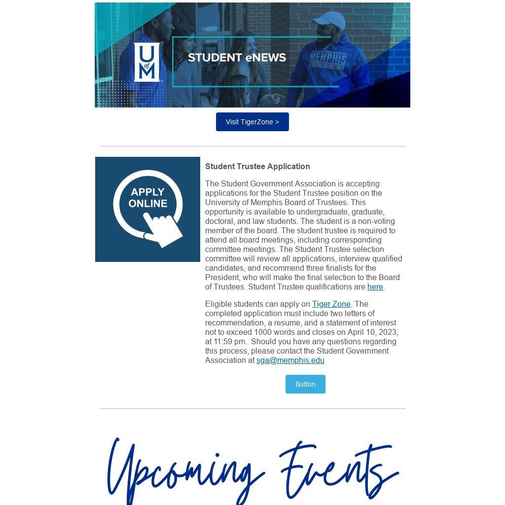 Eligible students can apply on Tiger Zone. The completed application must include two letters of recommendation, a resume, and a statement of interest not to exceed 1000 words and closes on April 10, 2023, at 11:59 pm. Should you have any questions regarding this process, please contact the Student Government Association at sga@memphis.edu