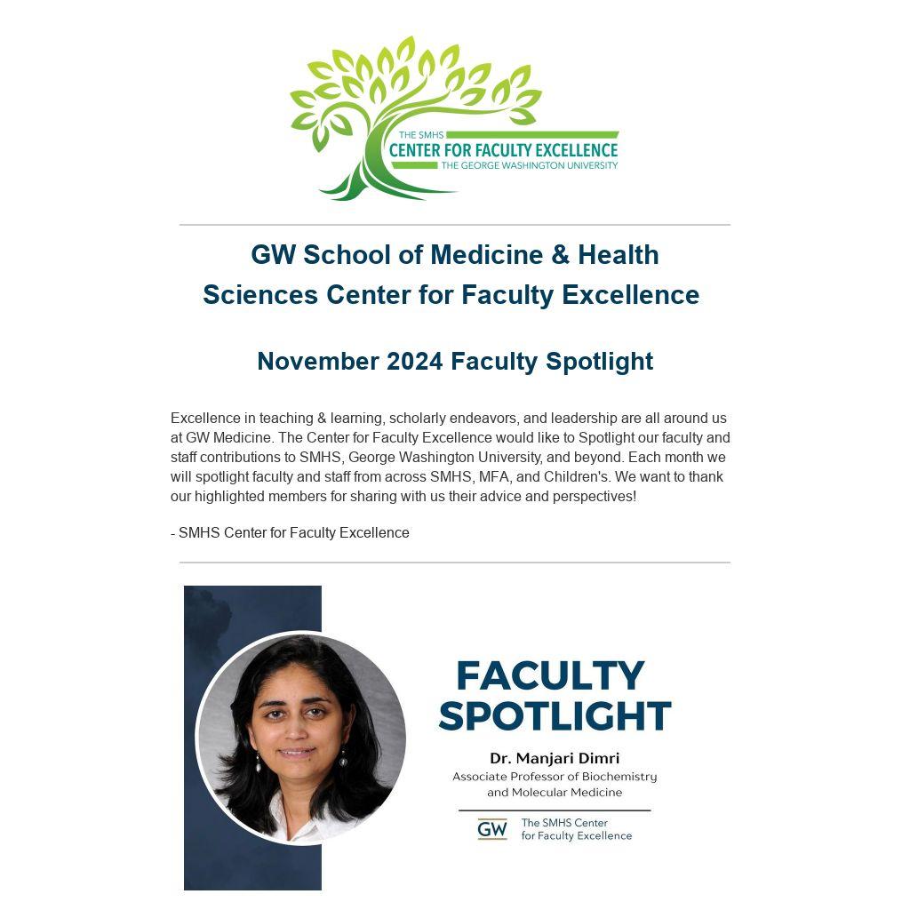 Excellence in teaching & learning, scholarly endeavors, and leadership are all around us at GW Medicine. The Center for Faculty Excellence would like to Spotlight our faculty and staff contributions to SMHS, George Washington University, and beyond. Each month we will spotlight faculty and staff from across SMHS, MFA, and Children's. We want to thank our highlighted members for sharing with us their advice and perspectives!