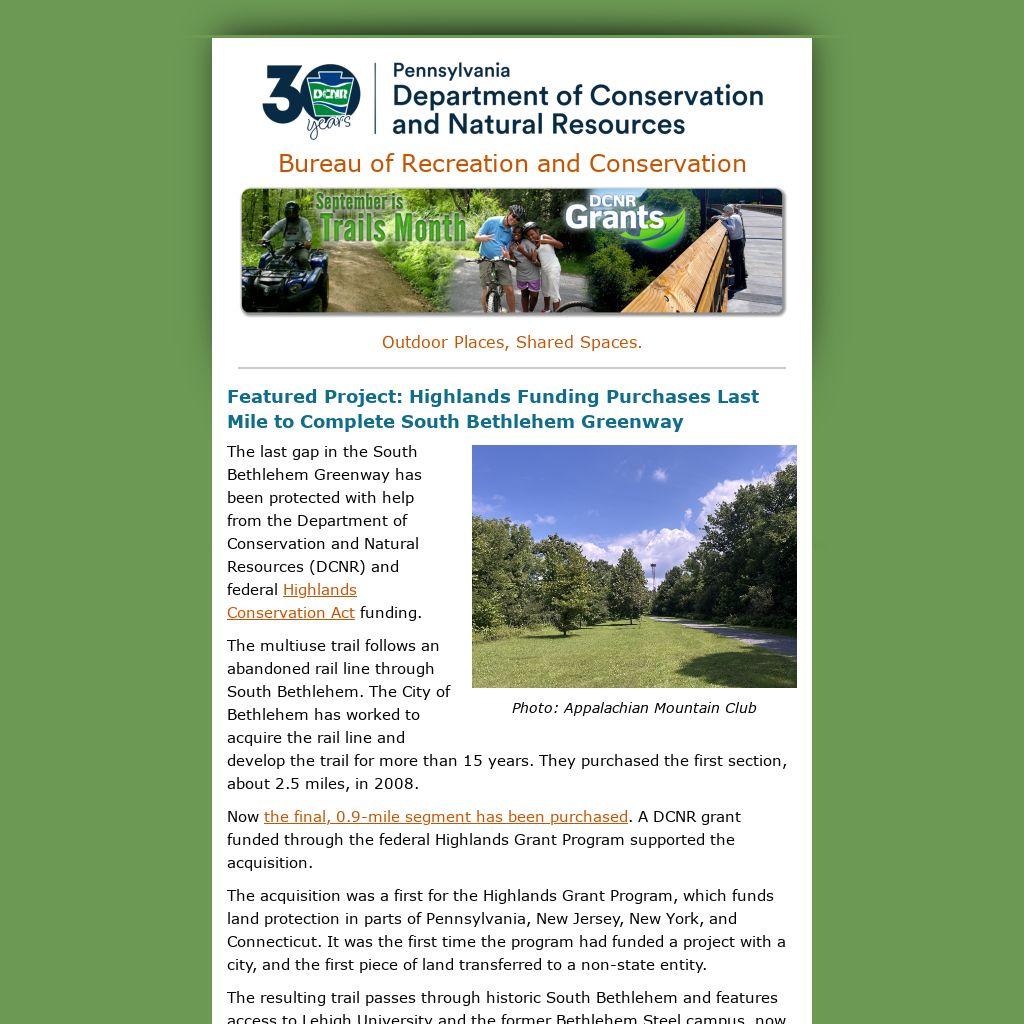 The last gap in the South Bethlehem Greenway has been protected with help from the Department of Conservation and Natural Resources (DCNR) and federal Highlands Conservation Act funding.