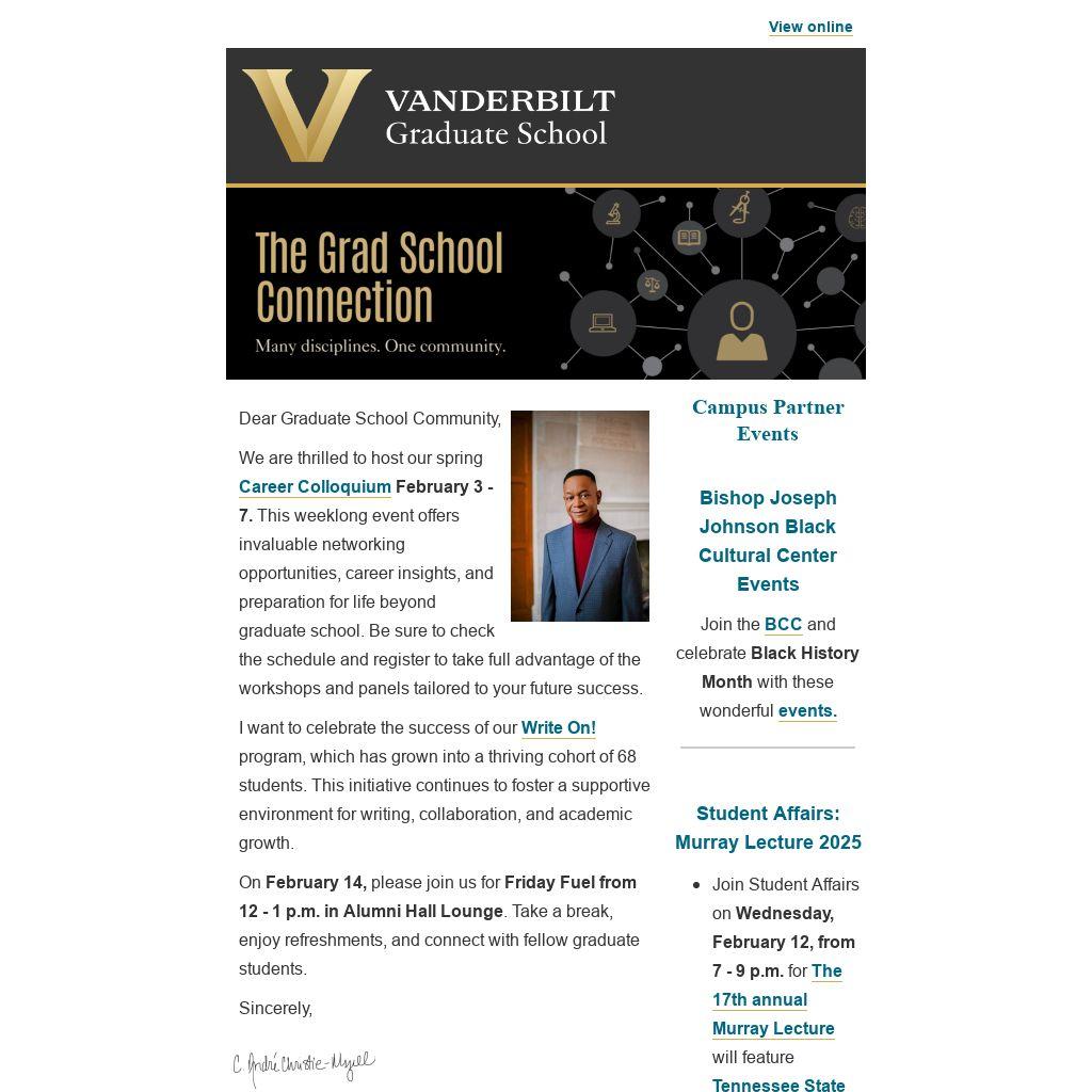 We are thrilled to host our spring Career Colloquium February 3 - 7. This weeklong event offers invaluable networking opportunities, career insights, and preparation for life beyond graduate school. Be sure to check the schedule and register to take full advantage of the workshops and panels tailored to your future success.