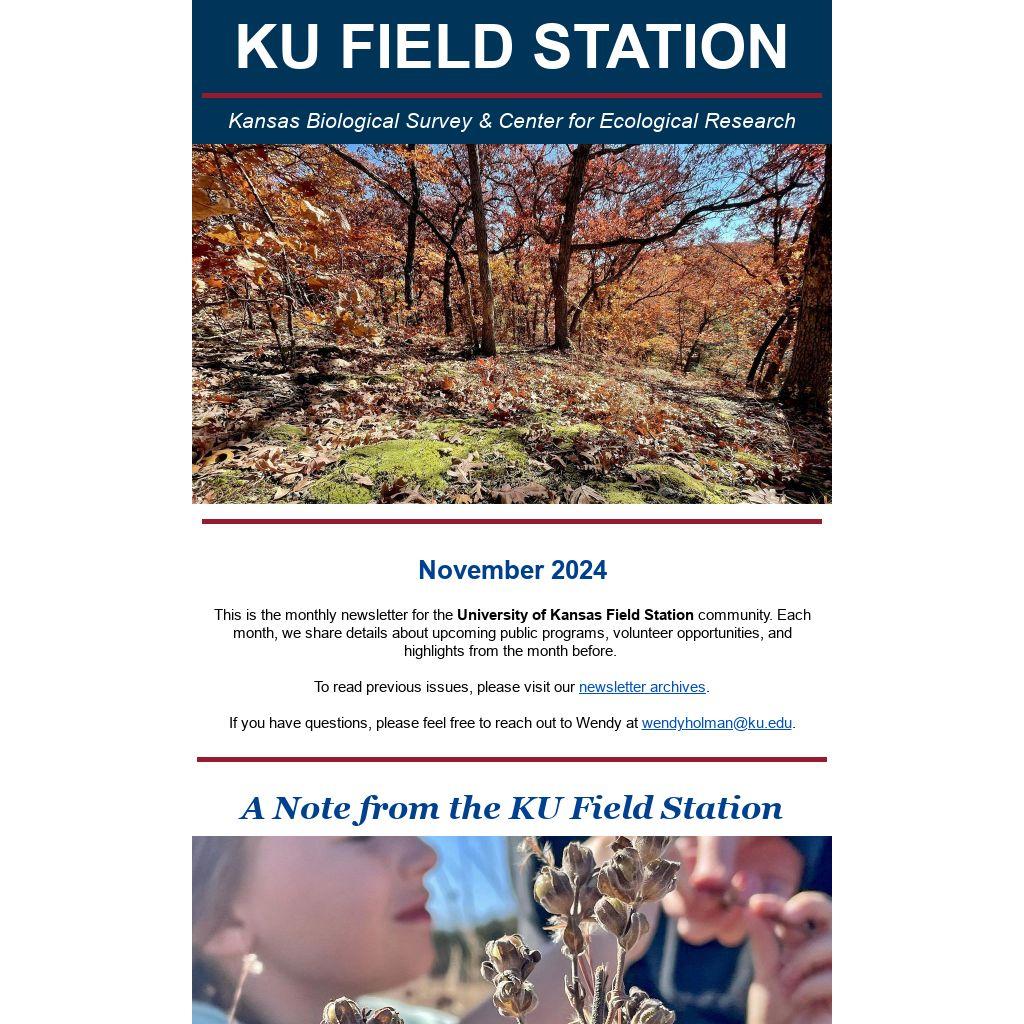 This is the monthly newsletter for the University of Kansas Field Station community. Each month, we share details about upcoming public programs, volunteer opportunities, and highlights from the month before.