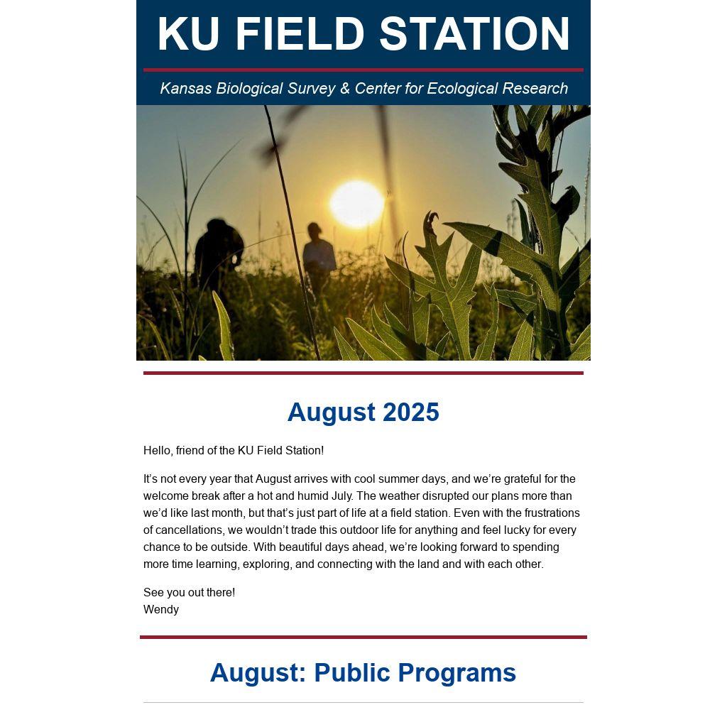 This is the monthly newsletter for the University of Kansas Field Station community. Each month, we share details about upcoming public programs, volunteer opportunities, and highlights from the month before.